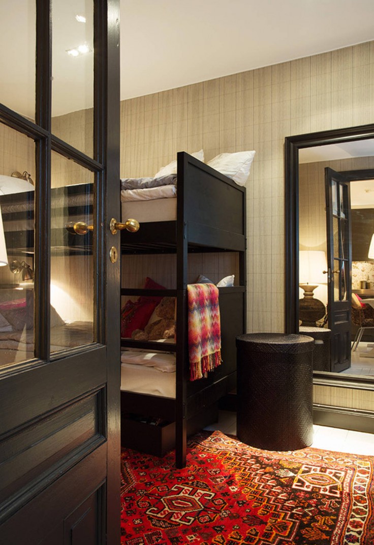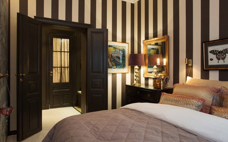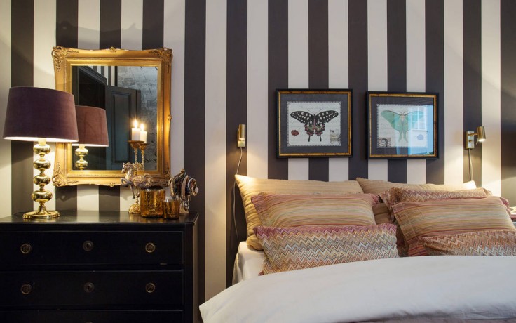 Vais a ver como también se utiliza el papel pintado, en este caso de rayas, con el que consigue ese toque chic en el dormitorio que se refuerza con los tonos dorados y la madera negra. En definitiva es una casa para conocer y porque puede ser que muchos de vosotros os indentifiquéis con ella. Está llena de elegancia y sofisticación que también le deja paso a ese toque de frescura.