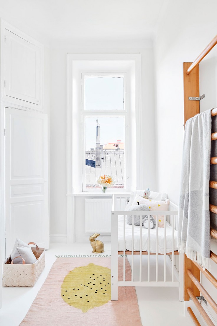Si os gusta el sentido más minimalista en la decoración y este color os hace ojitos, seguro que el apartamento que tenéis hoy aquí os encantará. Como vivienda nórdica que es, el blanco es el color que se lleva la palma pero el que haya detalles en rosa y estén en conjunto con unos toques sutiles de gris, le dan un punto diferente y especial. Este aspecto se refuerza con las líneas del los muebles como las del sofá, el dormitorio principal o el del bebé.